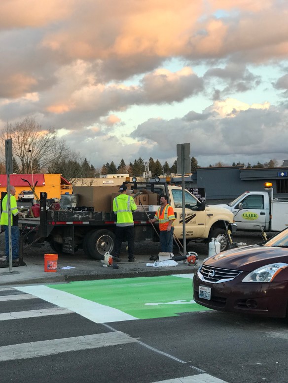 There hasn’t been a meeting I attended that I haven’t asked about the status of a bike box in that tricky intersection. It was supposed to happen over the summer, then fall. A few weeks ago, my wish was granted. I saw that the road was closed for construction and I could feel myself getting fussy and frothy. I took a detour onto the sidewalk. Then in my periphery vision I saw this puddle of green paint and the work crew waxing on the color. Could it be? It is really? My bike box!  As I approached my left turn I saw a kid and his mom on bikes about to cross the street. I exclaimed something about the bike box and when they didn’t understand I said, “Follow me and I’ll show you.” They followed as I crossed the berm to talk with the workers.