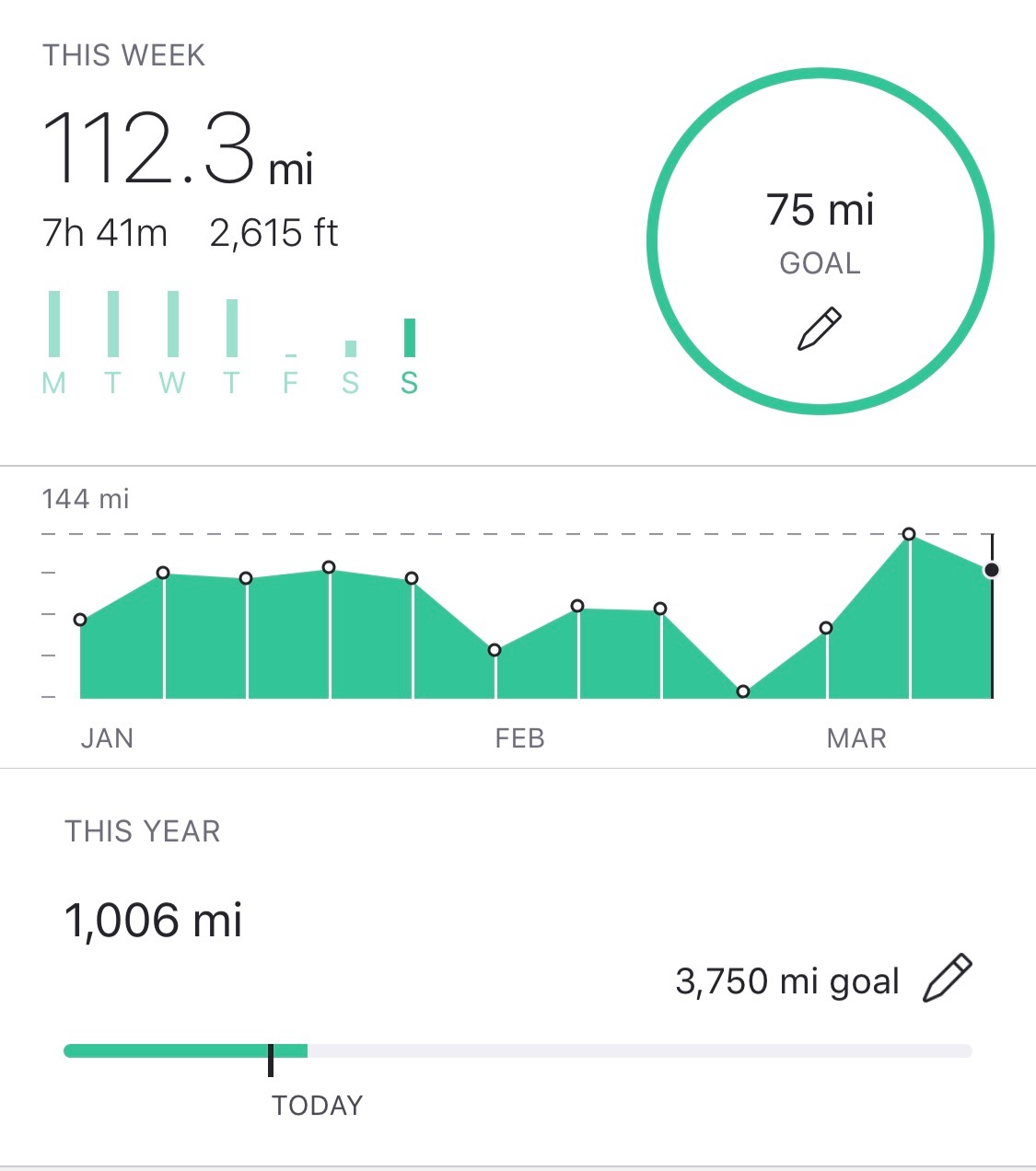 I was close to 100 for the week and a 1,000 for the year to date. Just 10 miles would accomplish both. I put my book down for an hour and went for a ride on a stunning Spring day and let the clear skies and emerging season wash over me. Then there’s that moment when you’re senses catch up with your brain and remind you that this is it. This is you soul getting filled up with all that’s wondrous and beautiful about surviving the winter. The buds are starting to burst, the days are getting longer and the wheels on the bike go round. Adding up the miles to the next 1,000.