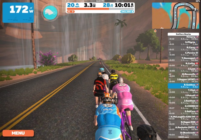 Download the Zwift companion app, it gives you easy access to using power ups or switching direction. Join some group rides once you get the hang of Zwifting and your power numbers. Check out ZwiftInsider (dot com) for all you need to know about riding in the virtual world. Most of all, pedal hard and enjoy! 🙂