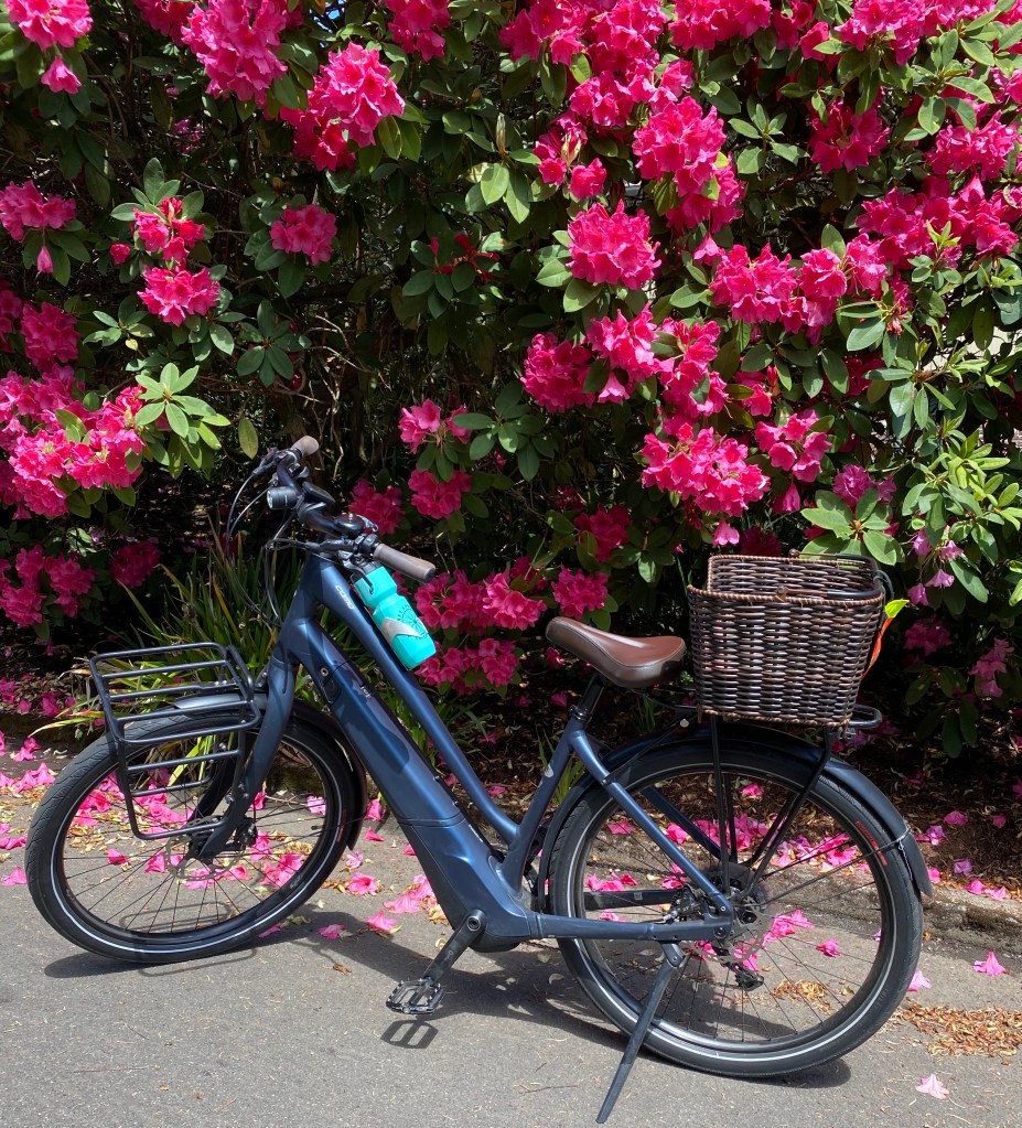 Isn’t that the way it goes. My second ebike is the one I ride now which is a Specialize Como 5 Turbo. I did call her Ella (Greek for come) but recently she’s become more of a Perri, as in Perry Como because it’s such a great name and when I had her in the bike shop for some annoying crooning and creaking, Perry became the obvious name choice. She has over 14,000 miles which means she’s taken the lead over any of my miles and my Kona mixte comes in at 13,000 as an analog bike. Both of these bikes fit me like designer jeans or like they were made especially for me. I can ride and ride and ride either bike without worry. All the adages come true with these two bikes. I can go the distance and wear whatever I want, kitted up or not, these bikes are my steelmates.