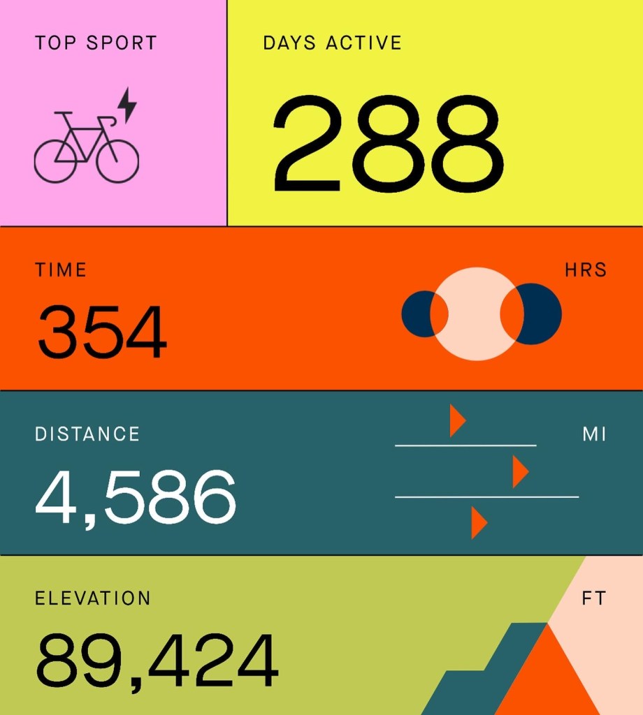 Data doesn’t lie. I might FEEL like I had my best year ever in the saddle and I count any day that I can bike as a big win, but the data tells another story. Strava says that as of this writing I biked 4,586 miles. Which is a pretty low number for me. Also that there were 77 days in which I did not ride or I’ll say, I didn’t use Strava, which happens. But 77 days seems really high. In find that inconceivable. I wasn’t injured this year. I didn’t take any vacations or huge swaths of time off. I doubt that number, yet it’s there. It adds up even though it does not add up in my mind. Which means that somehow something is amiss. I bike everywhere and on average 77 miles per week. That means 4,004 miles a year. Given that, Strava nailed it and then some. Even though it feels like I logged much more. Strava doesn’t measure feelings. Like many things right now in an ever on-going pandemic activities feel different for inexplicable reasons.
