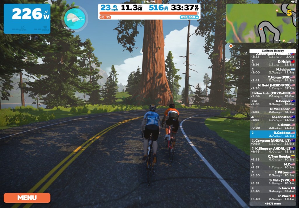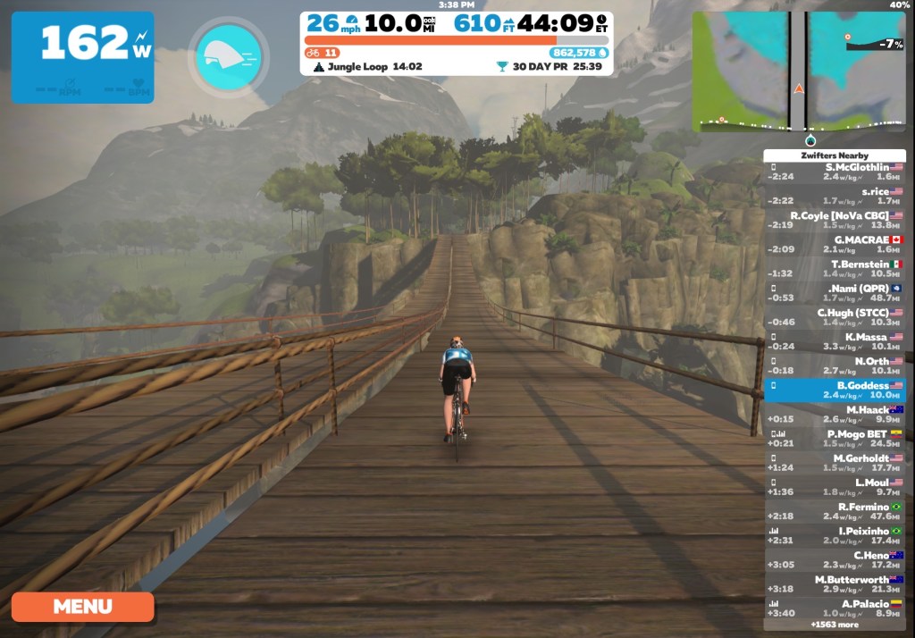 Why does Zwifting feel like I’m somehow cheating on my other bikes? Is it because I sweat a bucket of water or melt like snow in a sauna? Is it because it’s wicked fun and I feel compelled to yell at other riders, “Oh, no you are NOT going to pass me you sly weasel!” Recently while Zwifting I was in the cat and mouse chase with another rider. He’d get ahead and then I was speeding by. We did that for about 15 minutes. Massive fun! I wanted to use wave feature on Zwift Companion to push him off the road. You can’t, of course, but the race was on! Yeah, I was in the zone alright. Mean zone.